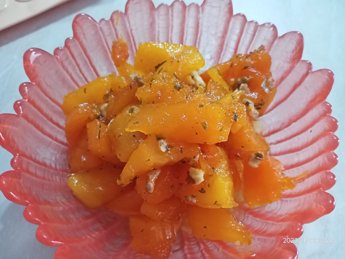 500г тыквы порезать небольшими брусочками и сложить в сковороду или сотейник с толстым дном.Засыпать стаканом сахара и оставить на 1 - 1,5 часа, чтобы тыква дала сок и сахар растаял. Затем поставить на огонь ниже среднего, не помешивая. И томить 20 мин под крышкой. Затем открыть крышку, добавить пол чайной ложки лимонной кислоты , перемешать. Посыпать сухой мятой (примерно 1 ст.л.). И тушить ещё 10 мин. Если сока много, то прибавить огонь. Тыква должна быть в сиропе, но жидкости не должно быть много . Выключить огонь, десерт посыпать измельчённым грецким орехом по вкусу. (Я добавляла примерно 50 г орехов) Приятного аппетита !!!