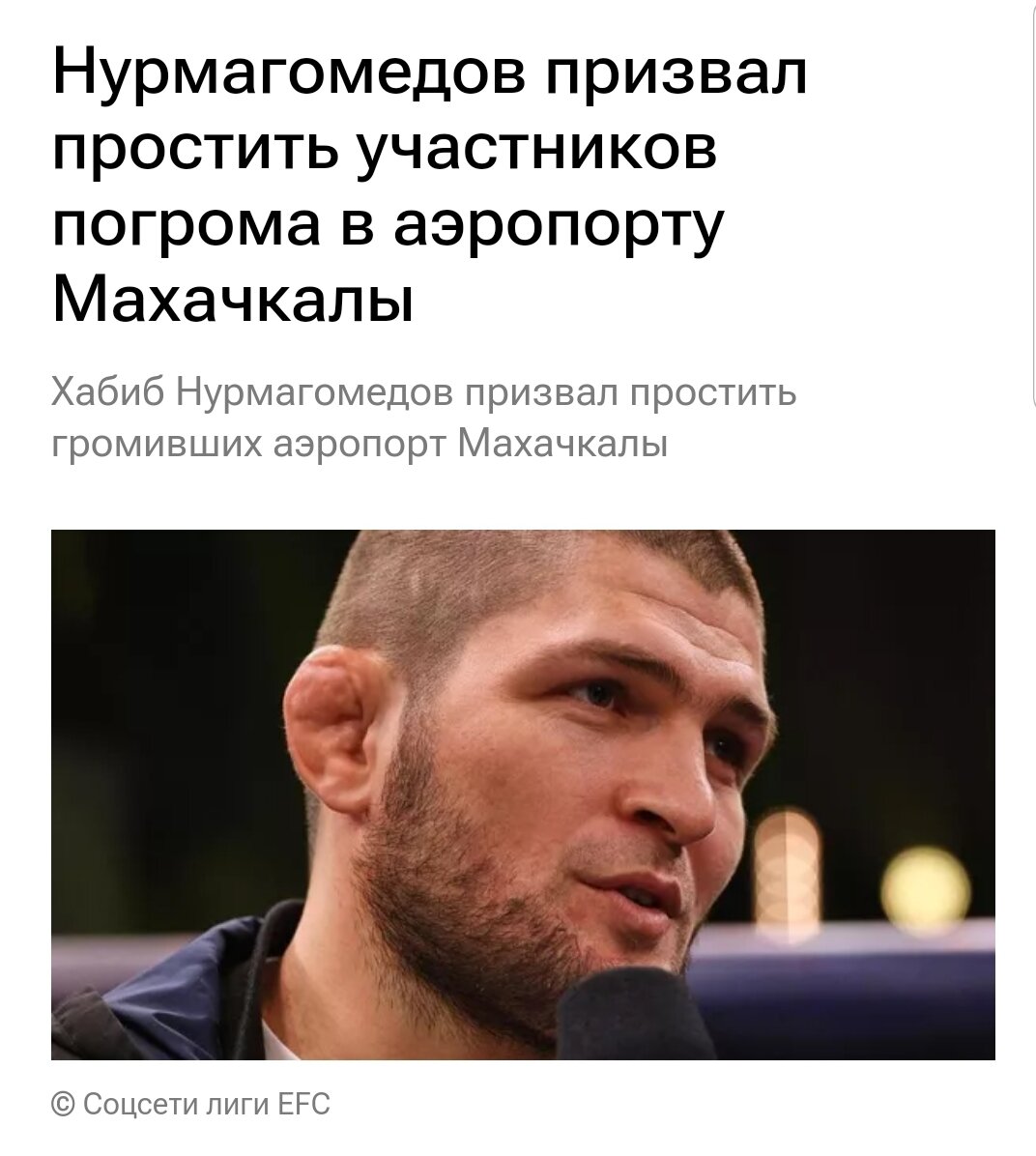 Нурмагомедов, сделал на своей странице в Instagram (деятельность Meta (соцсети Facebook и Instagram - запрещена в России как экстремистская), репост, публикации чемпиона Европы по вольной борьбе Махмуда Магомедова, который обратился к главе Дагестана Сергею Меликову, правительству республики и компетентным органам с просьбой не ломать "судьбы молодых ребят и показательно их наказывать" и "выйти на открытый диалог с народом". "Аллах прощающий и любит прощающих", — добавил Нурмагомедов к репосту. Сложно не согласиться с Ксенией Собчак, которая написала в своем ТГ канале: https://t.me/bloodysx/31655 "Очередная феерическая расстановка точек над фразой «Ксения Собчак сидит на двух стульях» на примере несостоявшейся хрустальной ночи в Махачкале.