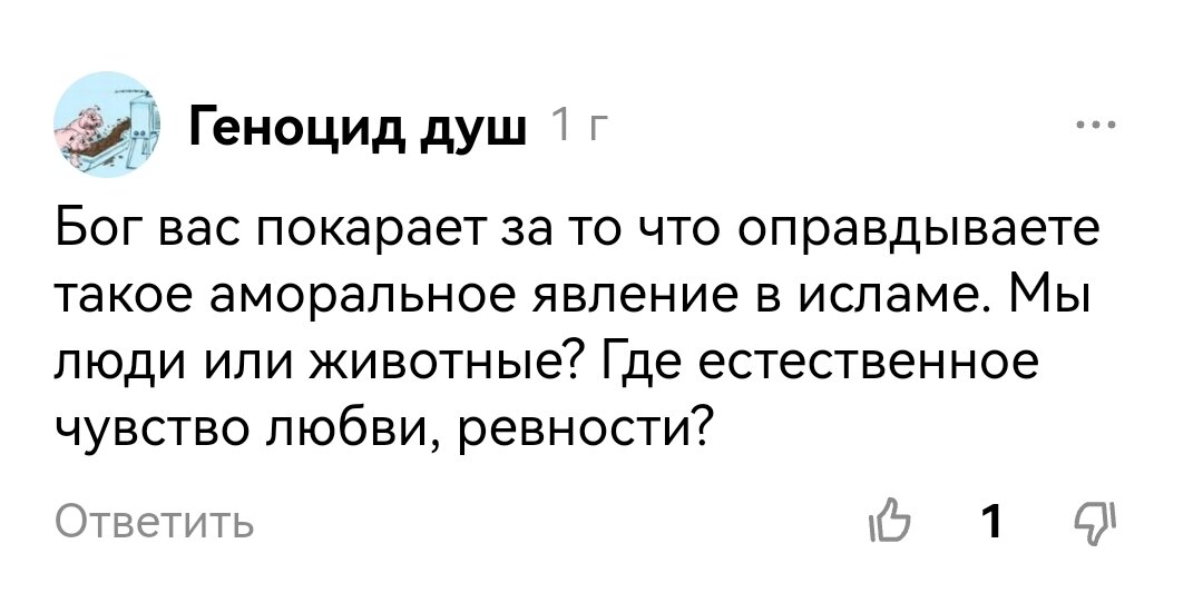 Сначала, читая комментарии, я никак не могла взять в толк, чего у нас люди так болезненно реагируют на многоженство. И не просто многоженство, а под "патронатом" другой религии - ислама.
