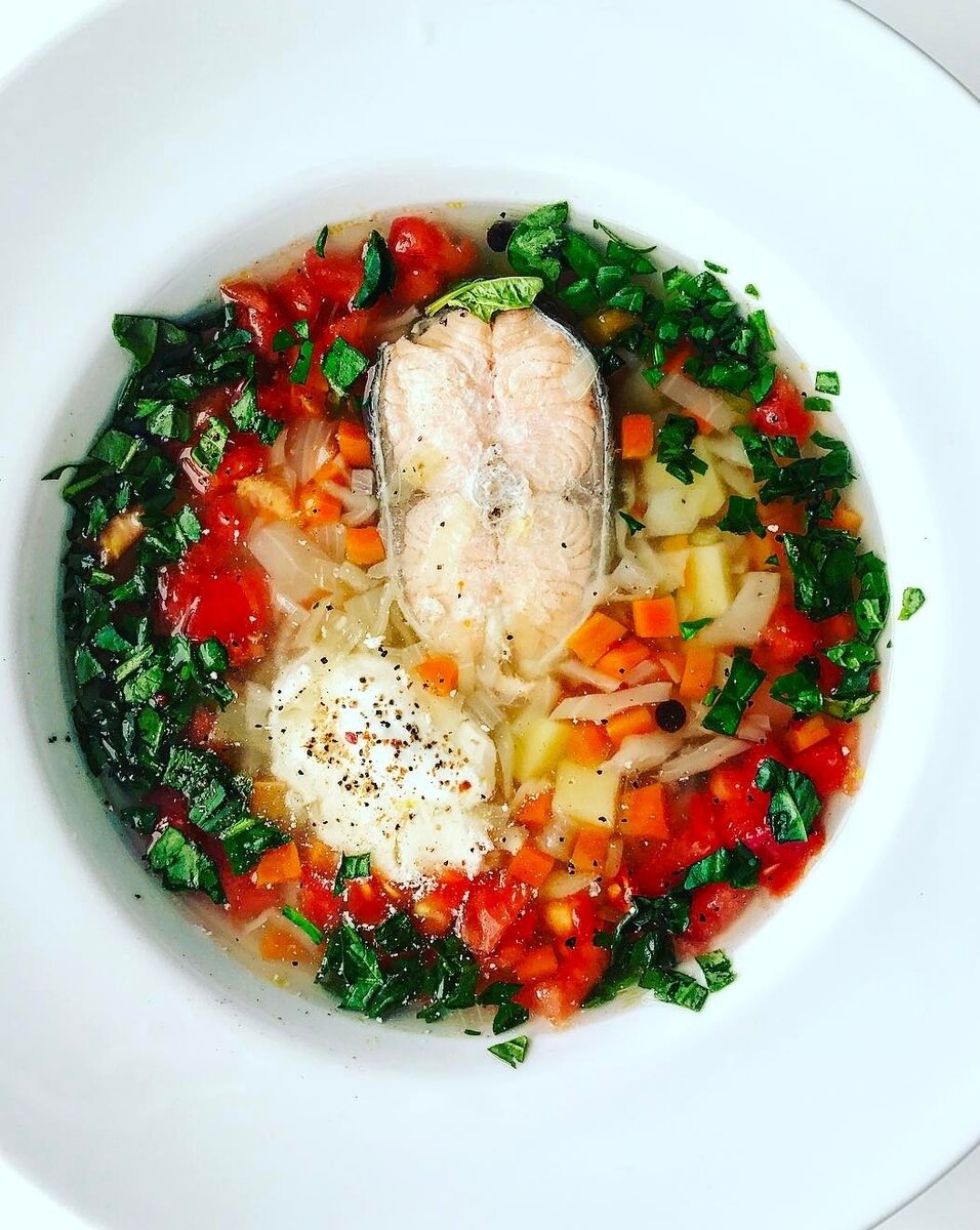 Суп дня 🤤 Щи с форелью и шпинатом ! Быстро, вкусно и полезно!!! Ингредиенты (на 3 литра очищенной воды). Форель : 500 грамм ; капуста 400 грамм ; картофель 3-4 штуки; морковь / -1 штука; шпинат -1 пучок ; белый лук - 1 шт. ; помидоры -2 штуки; Соль , черный молотый перец ; душистый перец - 5 горошин ; лавровый лист. Приготовление: В кипящую воду бросаем нарезанную кубиками капусту, через пять минут картофель. Пассеруем лук и морковь на оливковом масле в течение 3-4 минут (можно не обжаривать, на ваш выбор), добавляем в кастрюлю. Готовьте в течение 15 минут на слабом огне. Добавьте рыбу, нарезанную на стейки, лавровый лист и перец горошком. Готовьте в течение 7-8 минут. Выключите и бросьте нарезанные помидоры (без кожуры ) и шпинат . Подаем сразу!!!! Вкуснятина!!! При подаче можно заправить: сливками, сметаной или йогуртом!!! Приятного аппетита всем, кто обедает 😊