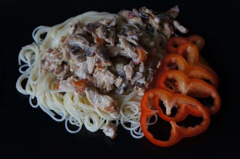 Решила я тут на днях приготовить что-нибудь вкусненькое. Подумав, что из продуктов есть в наличии, решила сделать индейку с грибами в сметанном соусе. Лук нарезала кружочками и отправила на сковородку подрумяниваться. Тем временем нарезала тонкими полосочками морковку. И тоже отправила на сковородку. В компанию к луку. Пока они румянились, я очистила и порезала шампиньоны. После чего добавила их к луку с морковкой. Пока поджаривались грибы я нарезала соломкой филе индейки и выложила ее на отдельную сковородку. Масло не добавляла. Пока все это готовилось, я в сметану (200 гр), добавила приблизительно 100 мл воды, столовую ложку муки, соль, перец по вкусу, и приправы. Тоже по вкусу. Сметанный соус добавила к грибам и овощам, туда же положила поджаренную индейку. Пока все тушилось - отварила макарошки, ну, то есть спагетти. А дальше. Выкладываем красиво на тарелочку спагетти. Сверху красиво кладем мясо птички с грибами. Хотела украсить базиликом. Но, увы... Нашла олько сушеный. Поэтом