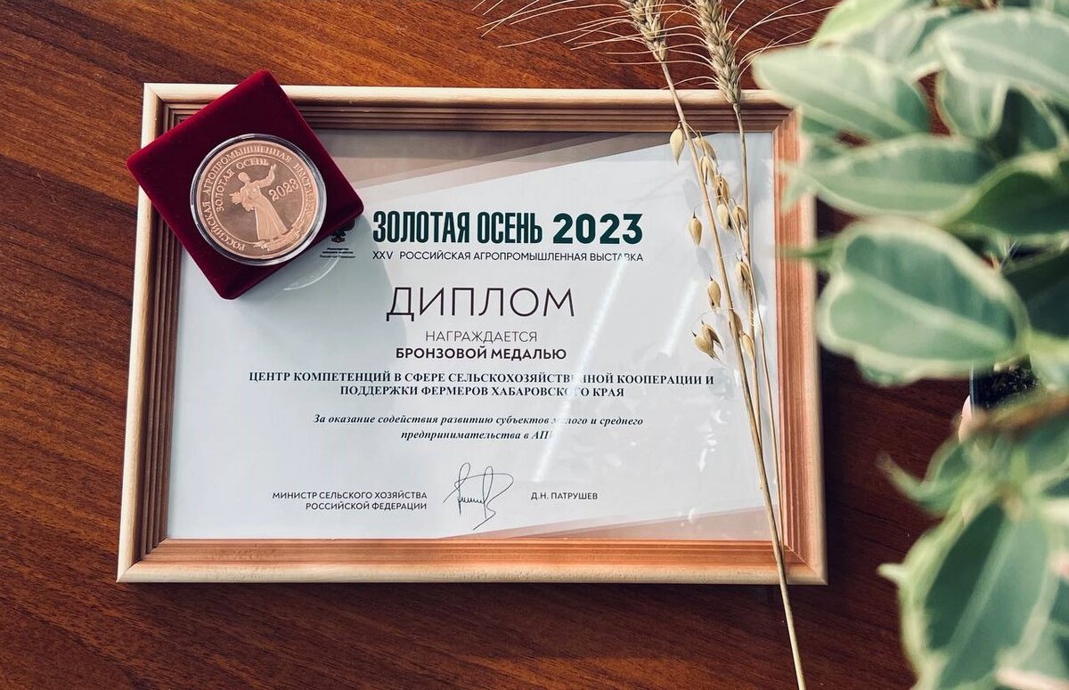 бронзовой медалью в сфере оказания содействия развитию субъектов малого и среднего предпринимательства в АПК. Награда вручена на 25-ой Российской агропромышленной выставке «ЗОЛОТАЯ ОСЕНЬ 2023» в Москве, приуроченной к празднованию Дня работника сельского хозяйства и перерабатывающей промышленности. В 2023 году Центром компетенций было оказано 438 консультационных услуг сельхозпроизводителям края, благодаря которым были запущены успешные проекты в сфере АПК Хабаровского края. Непосредственно при участии специалистов Центра компетенций созданы 5 кооперативов. Оказана помощь в подготовке документов на получение грантовой поддержки 27 сельхозпроизводителям, из которых 16 получили гранты на развитие сельского хозяйства. Проведено 6 мероприятий, в том числе рабочие встречи, совещания и обучающие семинары в области сельскохозяйственного производства. Подписывайся на наш телеграмм-канал и следи за новостями: https://t.me/KSF_27 Ссылка на все ресурсы АНО "КСФ": https://taplink.cc/ksf27