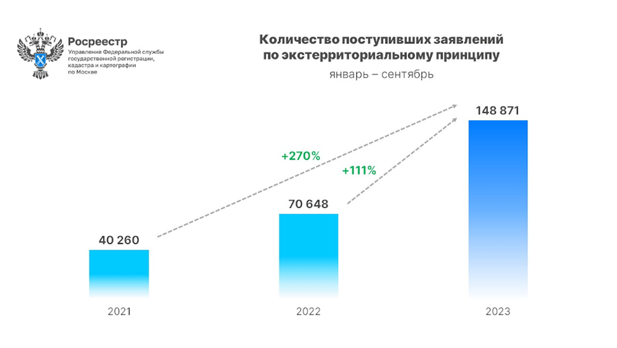 В январе — сентябре 2023 года жители столицы подали в управление Росреестра по Москве 148,8 тыс. заявлений на экстерриториальную регистрацию прав и кадастровый учет недвижимости. Это на 111% больше, чем годом ранее, сообщили в пресс-службе ведомства. Экстерриториальный принцип — это способ подачи и получения документов для проведения учетно-регистрационных действий вне зависимости от месторасположения объекта недвижимости на территории России. Статистика Росреестра включает сделки, совершенные москвичами за пределами Москвы. «Жители столицы стали чаще оформлять недвижимость в регионах по экстерриториальному принципу. Так, по сравнению с девятью месяцами 2022 года число таких заявлений увеличилось на 111%, а результат аналогичного периода 2021 года превышен в 3,7 раза (+270%)», — рассказал руководитель управления Росреестра по Москве Игорь Майданов. По данным столичного Росреестра, чаще всего москвичи покупали недвижимость в Московской и Тверской областях, а также в Краснодарском крае.