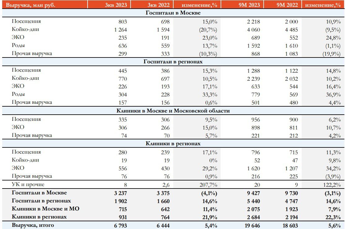 Компания опубликовала операционные результаты за 9 мес. Итак, выручка MD выросла на 5,6% до 19,6 млрд рублей. Региональные госпитали выходят на плановую загрузку и показывают уверенный рост выручки, а в московском регионе по-прежнему стагнация из-за эффекта высокой базы, поскольку в “ковидные времена” там наблюдался сильный рост. Многие инвесторы считают, что MD – это в первую очередь роды и ввиду неблагоприятной демографической ситуации в стране у компании должны быть слабые операционные результаты, однако на роды приходится лишь 12% консолидированной выручки, поэтому такая гипотеза является ошибочной. Основой бизнеса является стационарное лечение (койко-дни) и ЭКО, причем последний сегмент вырос почти на четверть и показывает стабильный рост как по количеству клиентов, так и по среднему чеку. В отчётном периоде компания купила 4 клиники в Ханты-Мансийском автономном округе – Югра и это не последнее приобретение. В ближайшие два года МD планирует расширить сеть на 3 госпиталя и 21 кли