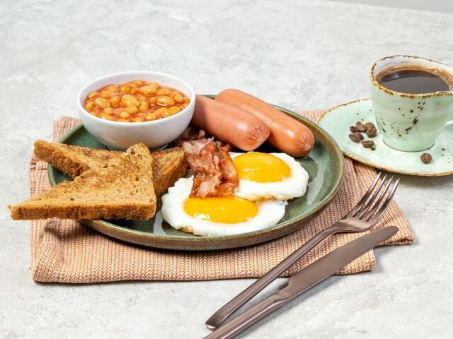 Традиционный английский завтрак состоит из определенного набора продуктов. В его состав входят обязательно яйца, бекон, тушеная фасоль и тосты. Дополнением служат помидоры и грибы. Расширенный завтрак включает блинчики с вареньем и овсяную кашу со сливками. Ингридиенты: Приготовление: Шаг 1 В сотейник выложите фасоль и хорошо прогрейте на среднем огне, пока соус не загустеет. Не забывайте помешивать, чтобы фасоль не подгорела. В конце добавьте немного сливочного масла и поперчите. Сохраняйте в тепле. Шаг 2 Разогрейте большую сковороду, добавьте немного масла и обжарьте полоски бекона до золотистого цвета. В той же сковороде обжарьте сосиски до румяной корочки. Шаг 3 В это же время на другой сковороде в небольшом количестве сливочного масла обжарьте грибы и разрезанный пополам помидор. Не зажаривайте сильно, они должны лишь слегка зазолотиться. Шаг 4 На антипригарной сковороде разогрейте масло и пожарьте яичницу-глазунью. Шаг 5 Приготовьте тосты: обжарьте их на сковороде, где жарился