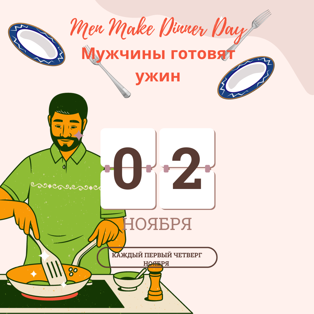Men Make Dinner Day На кухне что-то шваркает и шипит. Падает сковородка. Слышно как кто-то вслух ругается. Там явно что-то выходит из под контроля. Без паники. Это мужчина готовит ужин. Зачастую еда, приготовленная мужчина - просто «пища Богов» и зря над этим насмехаются. Сегодня Вы сможете это проверить, потому что убедить в этом своего мужчину ещё легче. В 1998 году в эфире утреннего шоу радио Сэнди Шарки провозгласил первый четверг ноября днем, когда мужчины готовят ужин. Есть даже несколько правил: На самом деле, эти правила - просто юмор и не более. Этот день для того, чтобы ваша любимая женщина смогла отдохнуть и посидеть один вечер перед телевизором и не беспокоиться «А что же на ужин?». Просто посчитайте, за год 364 ужина и это ещё нужно всем угодить!