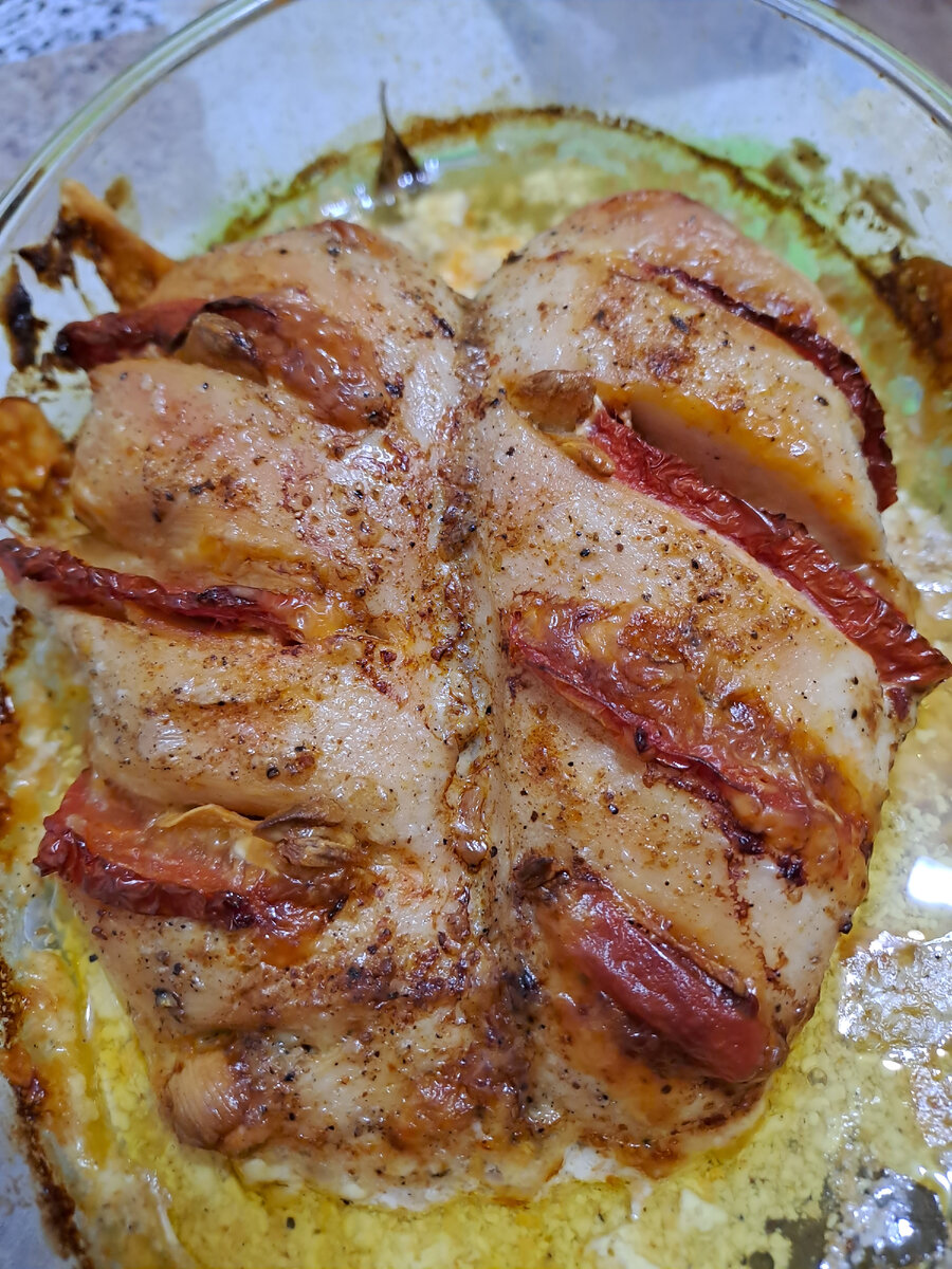 Сочная, мягкая куриная грудка. Друзья, всем привет. Сегодня хочу поделиться одним из многих рецептов, приготовления куриной грудки. Я запекаю её в духовке, предварительно начинив сыром, помидорами и по вкусу чесночком. Итак, начинаем. Берём куриную грудку, если она с кожей, я кожу снимаю. Грудку смазываю майонезом или сметаной, плюс можно добавить специи по вкусу. Я добавляю чёрный молотый перец. Делаю разрезы по 3, 4 с каждой стороны и в каждый "кармашек" вставляю кусочек сыра, помидорку и несколько слайсов чеснока. Чеснок по вкусу, на любителя. Мы его любим, я добавляю. И все. Перекладываю в форму для запекания, закрываю фольгой и ставлю в духовку. Минут за 10-15 до готовности, фольгу снимаю, для образования румяной корочки. Да,в форму для запекания я добавляю немного водички и обязательно добавляю лавровый лист. Он придаёт отличный аромат курочке во время запекания. Ну вот и все. В квартире вкусный аромат, в духовке готовится вкуснятинка. Такую курочку можно и в горячем виде и в