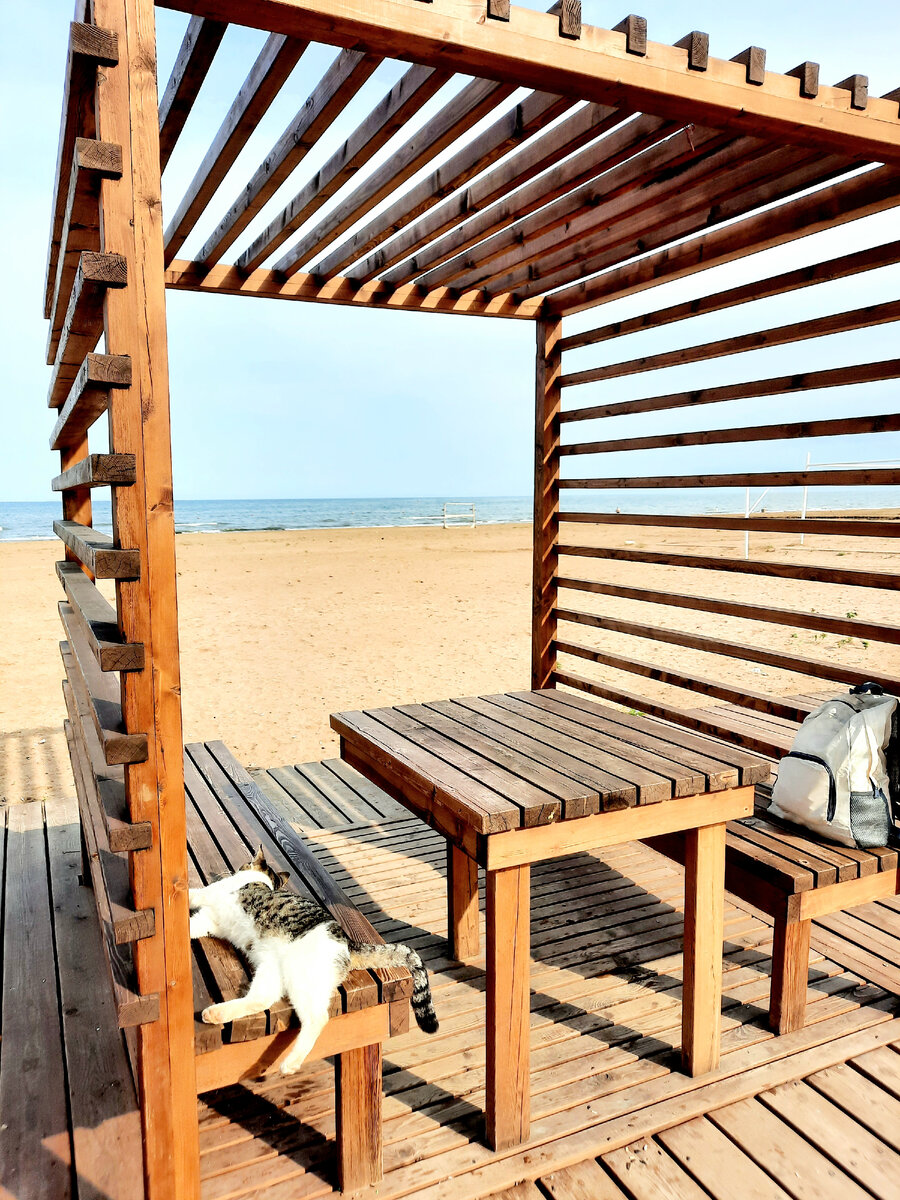 Есть туристические места обязательные к посещению, не всегда они западают в душу, но галочку поставили. А есть такие, про которые ты и не знал, а оказалось, что ВАУ! Для меня критерием таких мест служит желание попасть туда ещё и ещё, а также показать это место друзьям, например, вам. Проводив своих компаньонок домой, я пошла на пляж, но плавать я не рискнула, просто сидеть было скучно и я решила прогуляться до "золотой рыбки", которую мы увидели на горизонте ещё в первый день. Местные говорили, что это недостроенный ресторан. Можно, конечно, было проехать пару остановок на автобусе, но делать мне было всё равно нечего и я пошла по берегу пешком. И правильно сделала! Идти по деревянным настилам было комфортно, по пути было много вот таких беседок, летом здесь конечно аншлаг. А сегодня только мы с котиком, хотя народ есть - кто загорает,кто рыбу ловит. Есть и более масштабные бунгало. По мере удаления от набережной менялся берег, стали встречаться крупные булыжники, а песок был