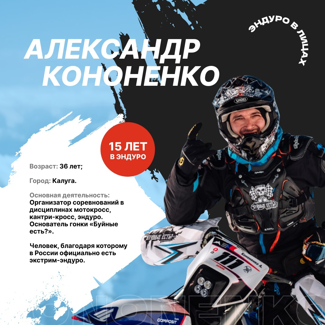 Новый герой нашей рубрики — человек, сделавший огромный вклад в развитие внедорожного мотоспорта в России. Выходец из Калужской области, одной из негласных колыбелей лучших гонщиков в дисциплинах эндуро и мотокросса, он с самого детства был увлечён мотоциклами.