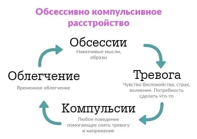 Навязчивые мысли мы с вами обсудили в предыдущей статье. Двигаемся дальше. Посмотрите на схему, вы можете увидеть, почему возникают навязчивые действия. Навязчивая мысль вызывает сильную тревогу. Человеку от этого очень дискомфортно, и, чтобы справиться с этой тревогой, он начинает предпринимать определенные действия, чтобы как-то снизить свою тревогу, предвосхитить недопустимое для него. На самом деле эти действия усиливают доминанту. Такие действия приносят лишь временное облегчение. Навязчивые мысли возвращаются вновь еще чаще и количество ритуалов и время на их выполнение увеличивается. В терапии ритуалов применяют три основных способа: 1. Постепенно уменьшаем количество повторов действий, доказывая себе, что от этого ничего не происходит, и ты в состоянии выдержать напряжение и тревогу и уходим от этого совсем. 2. Доводим ритуал до абсурда при перепроверках( намеренно увеличиваем количество перепроверок, чтобы мозг устал от этого). 3. Системная десенсибилизация, когда человек по