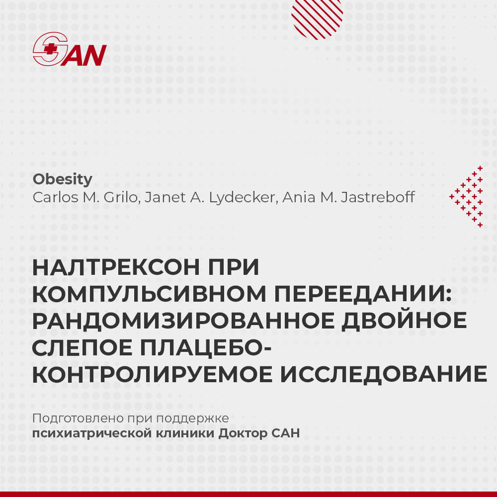 В рандомизированном двойном слепом плацебо-контролируемом 12-недельном исследовании изучалась эффективность налтрексона/бупропиона при компульсивном переедании с ожирением и без него. Восемьдесят девять пациентов (70,8% женщин, 69,7% белых, средний возраст 45,7 лет, средний ИМТ 35,1, 77,5 % с ИМТ ≥ 30) были рандомизированы в группы плацебо (n = 46) или налтрексона/бупропиона. (n = 43), рандомизация была стратифицирована по статусу ожирения и полу; 92,1% прошли обследование после лечения.