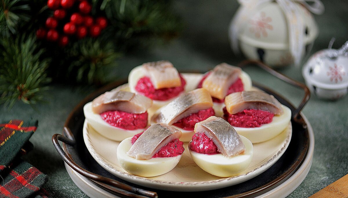 Новый год не за горами, а значит, пора присматривать рецепты для праздничного стола. Предлагаем приготовить оригинальный вариант селедки на шубе - яйца, фаршированные селедкой и свеклой. Вам понадобится (на 5 штук): 5 яиц 1 морковь 1 свекла 200 гр сельди, зеленый лук, майонез, специи и зелень по вкусу. Процесс приготовления: 1. Свеклу и морковь отварите, натрите на терке. 2. Вареные яйца разрежьте пополам, измельчите желтки и добавьте к овощам. 3. Добавьте зеленый лук, специи, рубленую зелень и майонез. 4. Получившуюся начинку выложите в половинку яйца, сверху разложите кусочки сельди. Приятного аппетита!