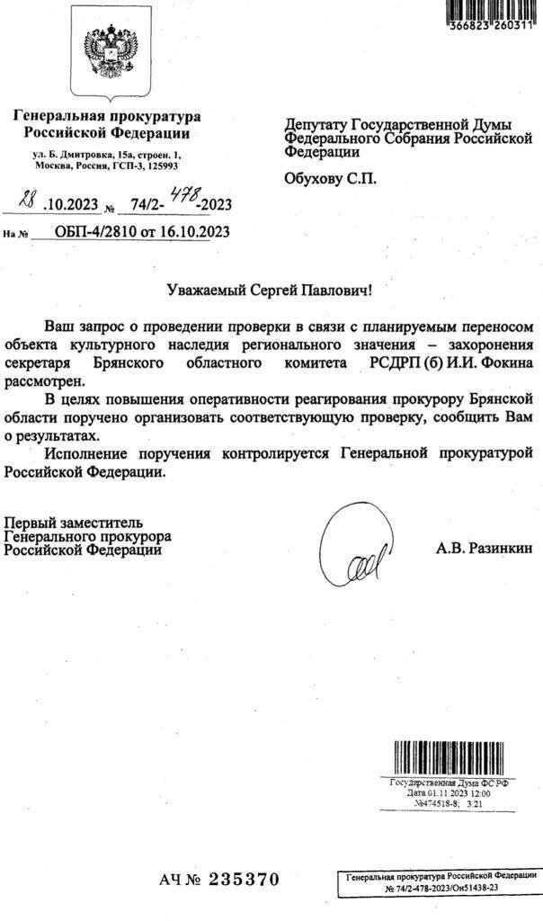 В Сеть выложили интересный документ. Если он настоящий, в чем почти нет сомнений, то прокурор Брянской области и первый зам мэра скоро вновь встретятся. Последний раз, напомним, их пути так или иначе пересекались весной этого года, когда прокуратура инициировала иск в суд против Антошина. Тот, не дожидаясь решения, сложил полномочия вице-спикера Думы и отправился руководить мэрией. Там он так рьяно взялся за работу, что вскоре опять столкнулся с надзорным ведомством. Ведь никто не тянул за язык Сергей Сергеевича и его пресс-службу, когда первого зама назвали “личным куратором” переноса могилы Фокина в центре Брянска. Теперь, судя по всему, грядет глобальная проверка прокуратуры. В Сети оказалось письмо из Генпрокуратуры депутату Госдумы Сергею Обухову. Тот требовал проверить действия брянских властей по “гробокопательству”. В ответе говорится, что “прокурору Брянской области поручено организовать проверку” и ответить Обухову о результатах. Письмо датировано 28 октября. При этом 30 октя
