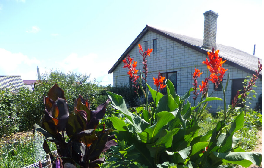 Итак, как поставили дом, так он стоял, окруженный подрастающей травой и неумелыми грядками. Видите радостную желтую трубу? Да, в 91 году подвели газ, к осени, счастью не было предела! Фото, конечно, более позднее, канны тогда я видела только у административных зданий, но трава и грядки , что за ними - остались на много лет.