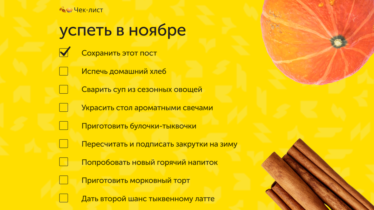 🍂 Только недавно мы с вами планировали кулинарные идеи на осень, и вот уже остался последний месяц до календарной зимы!Собрали новый список дел📋, которые мы хотим успеть сделать в ноябре🍁.💬 Ждем ваши идеи в комментариях!