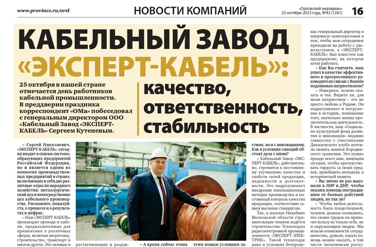 - Кабельный Завод "ЭКСПЕРТ-КАБЕЛЬ", действительно, стремится к постоянному улучшению качества и свойств своей продукции, надежности и долговечности. Это подразумевает внедрение инновационных методов производства и постоянный контроль качества продукции, соответствия самым высоким стандартам.
