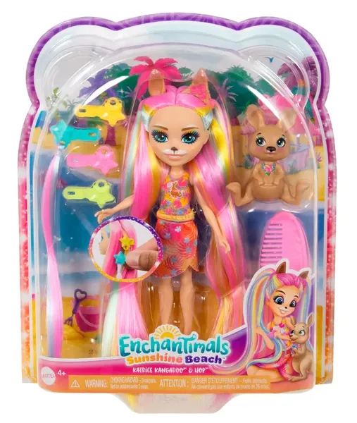 В конце декабря 2023 года, ожидаются новинки Enchantimals, на тематику: солнечный пляж. Помимо кукол, будут и игровые наборы. Давайте рассмотрим их! Katrice Kangaroo - кенгуру У куколки разноцветные волосы, собранные в два высоких хвоста, в комплекте идут и дополнительные пряди с разноцветными заколками, а в бонус к этому идет розовая расческа. Также идет маленькая фигурка в виде кенгуру. Sabindra & Tang - ленивец Питомца можно прикрепить не только к руке, но и к спине. У куклы красивые длинные фиолетовые волосы, украшенные ярким розовым ободком. Sunshine beach Ulia unicorn & bestie Pacifica - единорог Куколка-единорог, в комплекте идет с розовым единорогом, его можно прикрепить к руке. Высота куклы - 6 дюймов, в комплекте также есть ободок-рог. Trippi & Canopy - тукан Кукла интересная, нравятся ее крылья, вместе с ней идет и питомец - тукан. Cuddlers camper tent with bear Игровой набор с куклой-медведем и кемпингом с различными животными. Палатка выполнена в форме головы медведя с тре