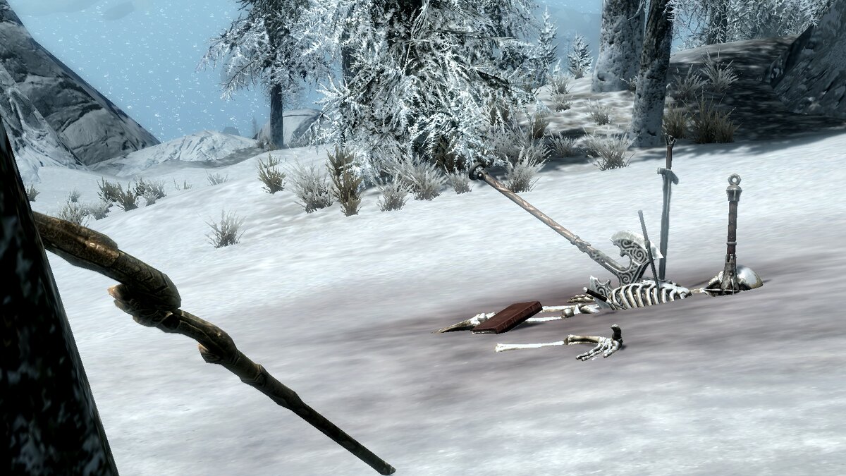 Есть в Скайриме одна секретная локация, где можно обзавестись мощным оружием, даже на первом уровне. Причём для первых десяти-двадцати уровней это оружие будет самым сильным из всех возможных (не считая предметов из клуба творчества). Конечно я говорю о бедолаге, который обнаружил внутри себя много лишних предметов и отправился к праотцам. Рядом с его скелетом лежит посох огненных шаров. Вот его-то и может прикарманить мимодовакин. Но как этот бедолага оказался в таком положении? Ведь судя по посоху, в снегу остался лежать некий волшебник. Как он умудрился потерять руку, поцеловаться с булавой и принять в себя два кинжала, меч и секиру. Тут только стрелы и кувалды не хватает. Интересный факт, если заявиться на это небольшое плато после получения 50 уровня, то оружие тоже будет подороже. Может быть в игре есть какие-то подсказки? Ну не перебирать же все самые безумные версии.