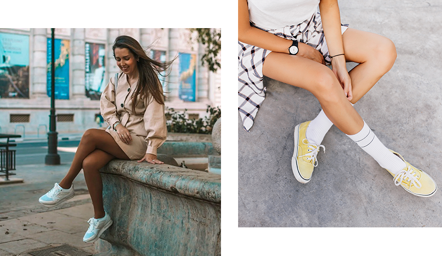 Если носишь кроссовки или кеды с платьями, выбирай одежду более спортивного формата. Например, это может быть платье поло или удлиненная рубашка. Минималистичные варианты хорошо сочетаются с актуальными в этом сезоне высокими белыми носками или более спортивными короткими.