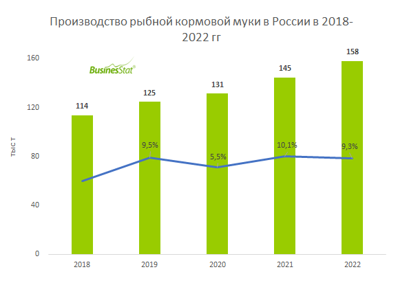 За 2018-2022 гг производство рыбной кормовой муки в России увеличилось на 39%: со 114 до 158 тыс т.
