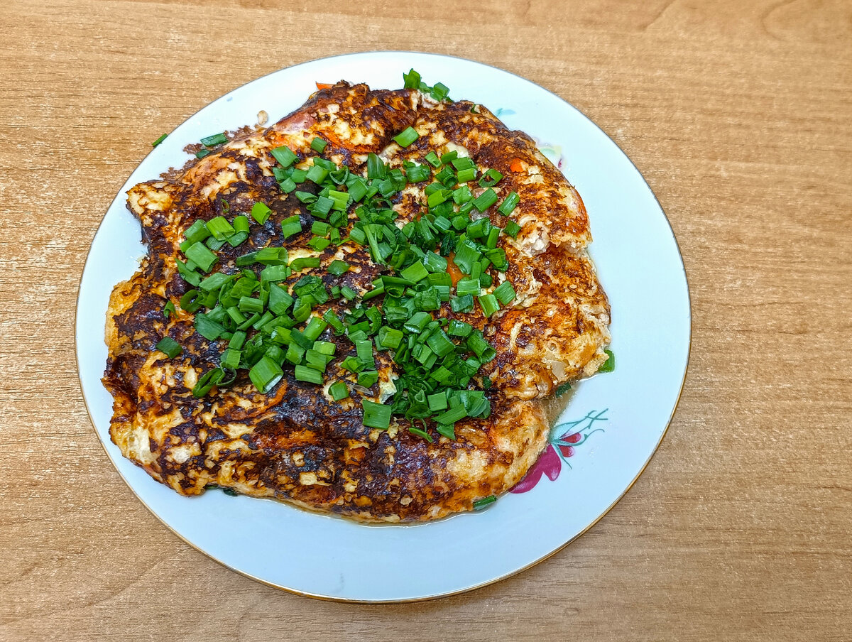 С помидоры сняли кожицу и тоже порезали. Яйца разбили в тарелку, чуть помешали. И к ним добавили всё остальное. Выложили всё на разогретую сковородку, предварительно смазанную подсолнечным маслом. Минут 10-15 жарили на слабом огне. Самое сложное в этом деле было перевернуть яичницу . А надо было, по рецепту, её, как блин, перевернуть, и на другой стороне ещё чуть поджарить.