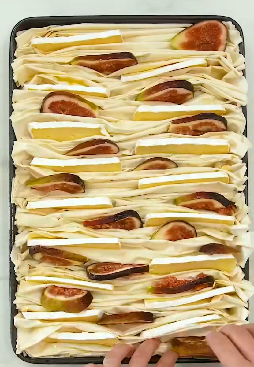 Ингредиенты 375 гр. Тесто Фило 150 гр. несоленого сливочного масла растопленного 🧈 2 яйца 🥚🥚 1 стакан густых сливок🥛 Соль перец 500 гр. сыра бри хорошего качества, нарезанного ломтиками (или другого мягкого сыра)🧀 6 шт. инжира, тонко нарезанного (к сыру также хорошо подходят груши🍐, можно заменить инжир) 3 веточки свежего тимьяна (можно заменить сухим) ---- * для этого рецепта использовали прямоугольную форму для выпечки размером 24 на 34 см. ПРИГОТОВЛЕНИЕ : 1. Достаньте пакет теста фило из холодильника, все еще в полиэтиленовом пакете, и дайте ему нагреться до комнатной температуры. 2. Разогрейте духовку до 180 градусов, в режиме с вентиляцией. Смажьте прямоугольную форму для выпечки размером 24х34 см сливочным маслом. 3. Смешайте яйца, сливки, соль и перец в кувшине или миске и взбейте до однородной массы. Отложите в сторону. 4. Положите два листа теста фило на рабочее место, один поверх другого, короткими сторонами теста фило к себе. Пальцами сложите тесто га
