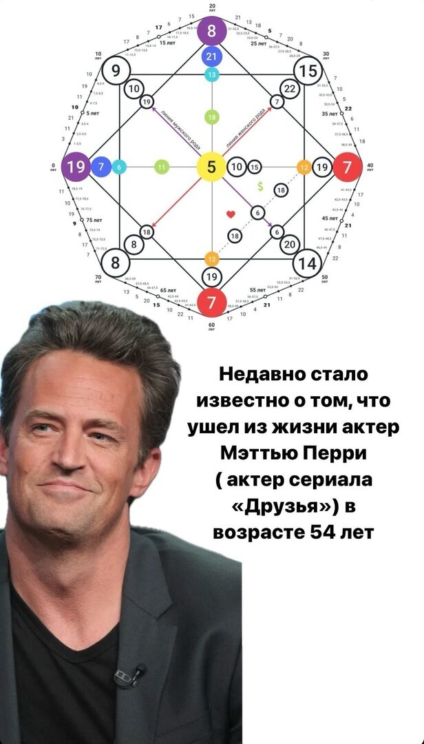 Всем привет! Сегодня моя статья будет посвящена прекрасному актеру, которого любили все без исключения. Жизнь актера сериала "Друзья" была одновременно успешная и трагичная. Сегодня я попробую раскрыть через Матрицу судьбы важные моменты, которые повлияли на жизнь артиста, начиная с детства и заканчивая последними днями его жизни. Актер родился 19.08.1969 В плюсе этой энергии: люди понимают свое сильное влияние на мир, они дарят позитив, занимаются активной деятельностью и их жизнь это одно сплошное творчество, такие люди знают как зарабатывать деньги и их сопутствует богатство. В минусе это энергии: это злое солнце. Может стать таким жарким, что все вокруг сгорит в том числе и сам человек. Люди с данным арканом в минусе цепляются за прошлое и не могут отпустить, у них вечный хаос и нищета. Они просто сжигают себя изнутри, страдают от депрессии и имеют зависимости. Вывод: Мэттью проживал в минусе, так как имел зависимости и жил в депрессии. "Известный голливудский актер впервые поя