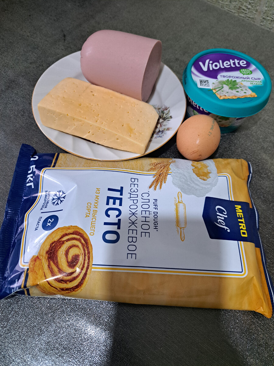 Варианты начинок могут быть разными, можно колбасу заменить на ветчину или отварную курицу; творожный сыр можно заменить на фету. По желанию можно добавить зелень. Нам понадобится: Приготовление: Сыр натираем на мелкой терке Колбасу нарезаем мелким кубиком Перемешиваем Пласт слоёного теста раскатать тонко Сверху выкладываем нашу колбасно-сырную начинку Поверх кладём творожный сыр кусочками Затем сворачиваем все в рулет, защипывая концы Рулет нарезаем на порционные кусочки, толщиной примерно 2 см. Каждый кусочек переворачиваем, немного прижимаем и укладываем на противень, застеленный пергаментом. Сверху смазываем слойки яичным желтком, по желанию посыпаем кунжутом и отправляем в духовку, разогретую до 180 градусов на 40-45 минут. Вот такие красивые и вкусные слойки у нас получились. Приятного аппетита!