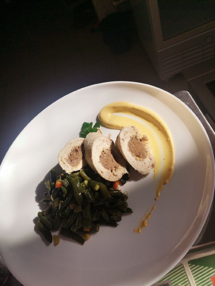 Ингредиенты: Приготовления : Шаг 1 Нарезаем лук кольцами, нарезаем тонко морковь и обжариваем с мытой печенью. Солим, перчим и добавляем мускатный орех. Шаг 2 Пока овощи и печень жарятся, филе разрезаем по полам и отбиваем. Отбитое филе солим, перчим. Шаг 3 Обжаренные овощи и печень перебиваем блендером. Шаг 4 На отбитое и подсоленное филе выкладываем готовый паштет, не докладывая по краям и заворачиваем. Шаг 5 Свернутый рулет, заворачиваем в пищевую плёнку и туго завязываем края. Повторяем такую процедуру 2 раза. Шаг 6 Варим такой рулет в тихо кипящей воде минут 15-30. Шаг 7 После отрезаем край и выкладываем рулет на тарелку и нарезаем порционными кусками. По желанию можно рулет обжарить на сливочном масле с размарином, чесноком, а можно оставить так или обжарить без добавок. Гарнир можно любой, например у меня обжариная на сливочном масле стручковая фасоль с луком и морковью, немного подсоленная. С сырным соусом. Приятного аппетита ❤️ #куриные_рулетики #готовим_вкусно