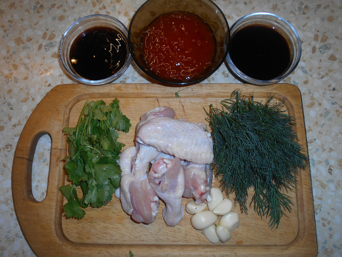 Для приготовления этого рецепта нам потребуется: Куриные крылья разрезать по суставам, верхнюю часть крыла мы использовать не будем, но и выбрасывать не будем. Из этой части впоследствии можно приготовить легкий куриный бульон. Остальные части крыльев мы будем мариновать в смеси из соевого, тирияки и острого чили соусах 1 час. Пока крылья маринуются мы нарезаем зубчики чеснока мелкими брусками, кинзу и укроп также шинкуем. Включаем духовой шкаф на 200*С. В маринованные крылья добавляем смесь зелени и чеснок, тщательно перемешиваем. В рукав для запекания складываем наши крылья и поливаем сверху жидкостью от маринада. На противень кладем пергамент и уже на него укладываем наш рукав с крыльями с отсеками дырочек кверху и ставим в духовой шкаф на 45-55 минут. Наши крылья по-восточному готовы. Приятного аппетита!