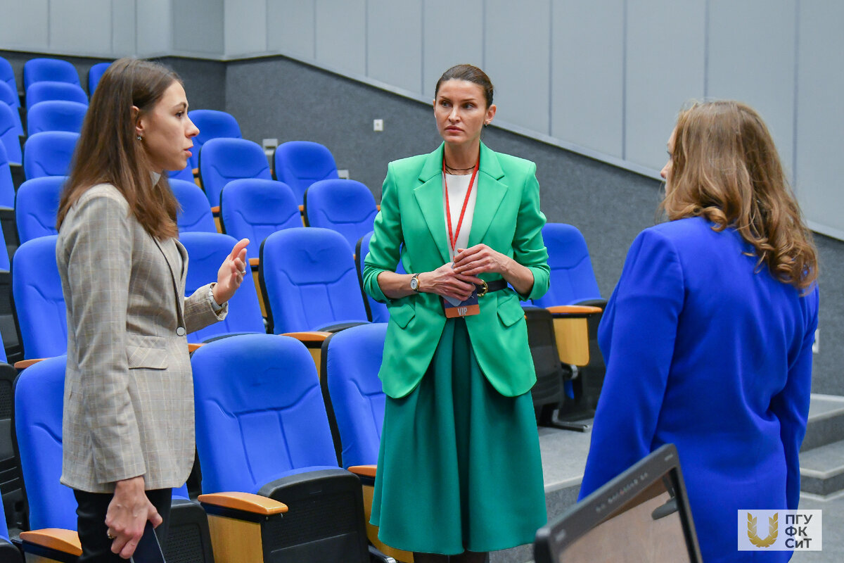 “А во время пандемии эти кинозалы вы тоже использовали?” — уточняет гостья и получает утвердительный ответ от начальника управления по организационно-административной работе Дарьи Зайберт, “Наши педагоги проводили здесь свои занятия”.