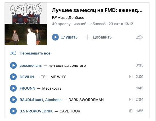 Начинаем делиться новой музыкой ноября. По календарю FMD месяц начался 21 числа. За прошедшую неделю вышло 53 сингла и 1 альбом. Рассказываем о пятёрке лучших. Ещё 6 интересных треков найдёте в конце поста 5 место 3.5 PROPOVEDNIK — CAVE TOUR Донецкий фонк-рэпер продолжает накидывать максимально стильного вайба. Бит сделал HAZY HAZE — хз, кто такой, но чел очень шарит. Только профи может сделать настолько минималистичный бит качающим и попадающим в каноны мемфиса. Это круто тем, что здесь минимум инструментов, в том числе флоу, при этом трек не теряет стиля и кача. Советуем слушать это на колоночке, услышите вайб во всей красоте. 4 место RAUDI.$tuart, Atxxhena — DARK SWORDSMAN Пост-фонк адепты поражают всё больше с каждым релизом, выходя всё дальше за рамки жанра. Стюарт — один из немногих, кто делает фонк реально интересным, экспериментируя со стилем. Получается дикий вайб, непохожий на другие и одновременно, напоминающий что-то давно знакомое. Донецкие фонкеры могут навалить такого
