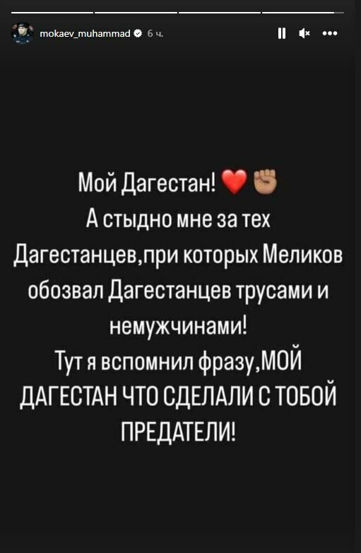 Боец UFC дагестанского происхождения Мокаев резко ответил главе Дагестана Меликову, который назвал участников беспорядков в аэропорту Махачкалы «жалкими, зверопободными трусами». «В Дагестане трусов нет! У нас смелости вагон! Мой Дагестан!» - написал в ответ на эти слова в своем Instagram-аккаунте Мокаев. Напомним, что инцидент произошел вечером 29 октября. Группа людей ворвалась в аэропорт Махачкалы и пыталась напасть на евреев, прибывших рейсом из Тель-Авива. Следственный комитет России возбудил уголовное дело по статье о массовых беспорядках. Meta* признана экстремистской организацией