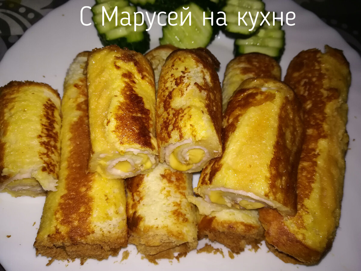 Доброе время суток дорогие Друзья!!! Такие рулетики очень хорошо подходят для завтрака, а ещё их можно взять с собой на работу, или в дорогу. Количество продуктов указано из расчёта на 6 штук. *** Необходимые ингредиенты : ХЛЕБ ТОСТОВЫЙ - 6 ШТУК ВЕТЧИНА - 6 КУСКОВ СЫР - 6 КУСКОВ ЯЙЦО - 1 КРУПНОЕ, ИЛИ 2 НЕБОЛЬШИХ МАСЛО РАСТИТЕЛЬНОЕ - 1 СТОЛОВАЯ ЛОЖКА *** Для приготовления рулетов нужно брать специальный тостовый хлеб, или обычный прямоугольный. Ветчину и сыр нарезаем очень тонко, мне очень нравится использовать здесь специальный плавленный сыр, который продаётся уже нарезанный пластинами. Каждый кусок хлеба тонко раскатываем скалкой (при желании корочки можно обрезать, но с ними вкуснее). На хлеб кладём ветчину и сыр, затем аккуратно сворачиваем в рулеты. Если позволяет время, можно дать им полежать свернутыми минут 15. В глубокой миске взбиваем яйцо. Обмакиваем рулеты в яйцо, и выкладываем в нагретую сковороду смазанную маслом. Обжариваем по 1-2 минуты с каждой сторон