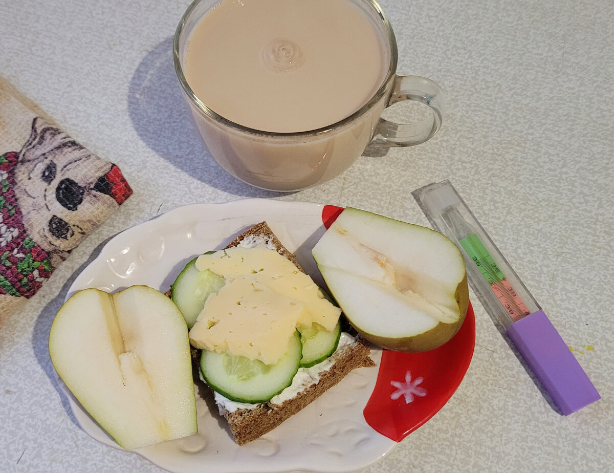 Пришлось придумывать что-то простое и для нее вкусное На бутерброде: Хлеб зерновой Сыр творожный Огурец Сыр твёрдых сортов Чай с молоком и груши. Позже заменила чай на молоко с ягодами 😊 Будьте здоровы! 💐