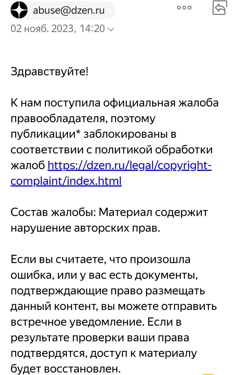 Моему каналу в Дзен почти 6-ть лет. И все это время пишу о книгах и практической пользе от активной работы с информацией. В блоге почти 1000 публикаций в различных форматах. И почти в каждой из них есть информация о книгах и из книг. Но вчера мне внезапно написали Заблокирована одна публикация, которая ничем не отличается от сотен других на моем канале. И потому у меня возник резонный вопрос — почему именно эта публикация? И запросил содержание той самой жалобы, чтобы хотя бы понять что и где я нарушил. Но как видно по этому письму (а оно было последним в цепочке переписки за вчерашний день) дзеновцы включили режим глуповатого исполнителя — мы не при делах, это просто жалоба провообладателя. В теории я понимаю в чем может проблема. В теории можно было бы написать в издательство и попытаться урегулировать вопрос самостоятельно. Но во всей этой истории удивляет позиция Дзена — просто блокируем, присылайте непонятно какие документы и будем разбираться. В тот период, когда дзеновцы де
