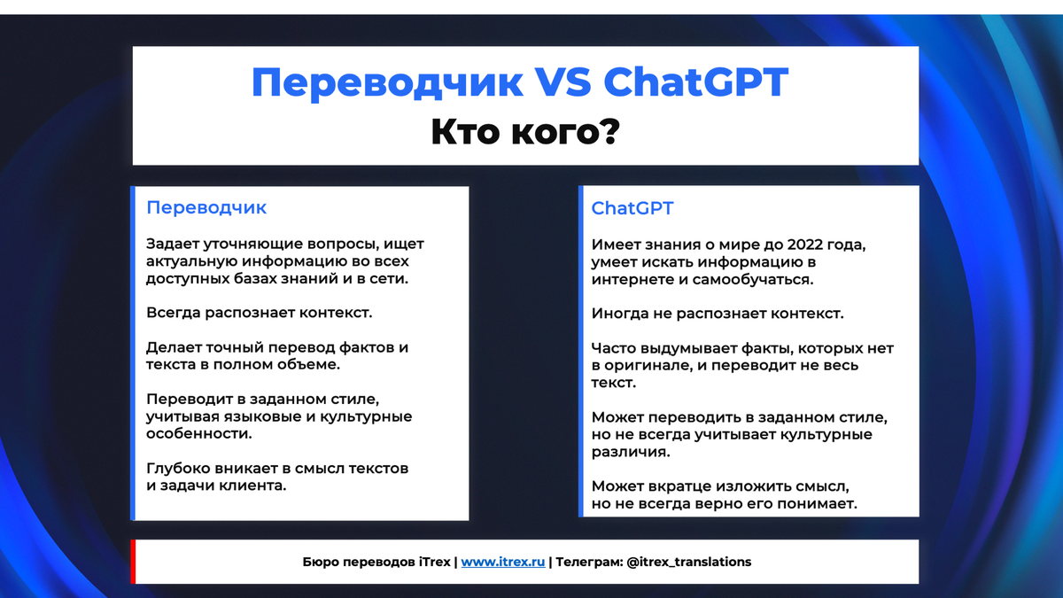 Таким словом стала аббревиатура “AI”. На английском языке она расшифровывается как “artificial Intelligence”, что в переводе на русский значит «искусственный интеллект» (ИИ). Об этом говорит исследование Collins Dictionary. Не заходит контент? Ставь 1 в комментариях. Если любопытно, то ставь 5. По мере развития ИИ, использовать этот термин и сами нейросети стали чаще: для создания текста и изображений, презентаций и даже перевода текстов. Кстати, недавно мы сравнили возможности chatGPT и профессионального переводчика. Результатами поделились в инфографике. По словам управляющего директора Collins Dictionary Алекса Бикрофта, в этом году ИИ был в центре внимания из-за быстрых темпов распространения. На Youtube-канале iTrex еще больше интересного и полезного контента о переводах, языках и международном бизнесе. Заходите и жмите на колокольчик! 🔔 Помните, как лет 30 назад электронная почта или видеозвонки были чем-то из области фантастики, а сегодня это вполне привычные нам каналы коммун