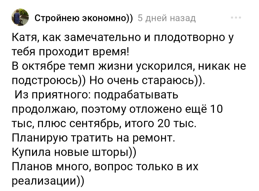 Добрый день, друзья! Спасибо всем, кто остается и участвует со мной в проекте. Подведем ваши итоги за октябрь: - Оля, желаю тебе вдохновения и решимости в исполнении всего задуманного! Ремонт - это хороший шаг для перезагрузки. *** - Лена - ты молодец! Желаю тебе и дальше держать эту планку! Для меня отказ от шоколада недостижимая задача. *** - Оля, отлично! А еще у тебя интересный эксперимент по питанию, согласно Росстата. *** - Наташа, очень насыщенный получился месяц, несмотря на болезнь! Обязательно сохрани конвертик для себя🫶 *** - Катя, зато ты теперь знаешь, что подгонять себя и ограничивать во времени - не твой метод поддержания порядка в доме, есть и другие. Комфорт - это главное! *** - Дина, если при таком насыщеном рабочем ритме дома все же чисто и уютно - значит твои мужчины умеют поддерживать порядок. Это здорово! Удачи с получением категории! Спасибо за ваши комментарии! Желаю вам удачного ноября!
