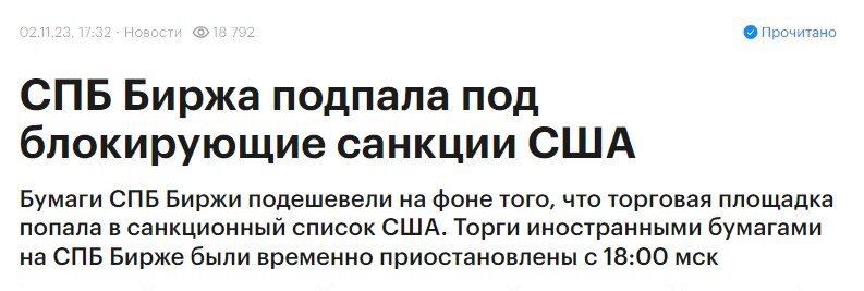 Вчера российский фондовый рынок был ошарашен неожиданной новостью о том, что США расширили SDN-list российских компаний, и среди прочих, под блокирующие санкции попала СПБ Биржа. На фоне этой новости акции самой компании начали резко падать, а торги иностранными бумагами были полностью остановлены с 18:00 2 ноября. Причем приостановили торговлю не только американскими бумагами, но и, например, гонконгскими, и даже российскими. Сама биржа распространила сообщение о том, что возобновить торги планируется в понедельник 6 ноября, а клиентские активы от санкций не пострадают. Оно было вот таким коротким, без какой-либо конкретики: Введенные санкции не затронут активы клиентов. Информацию о дальнейших действиях опубликуем в ближайшее время. Позднее появилось новое сообщение о том, что торги российскими бумагами будут восстановлены 3 ноября с 14:00. То есть, пока не ясно, что будет дальше, и сейчас можно только строить предположения. Многие эксперты фондового рынка, а также юристы уже усомнил