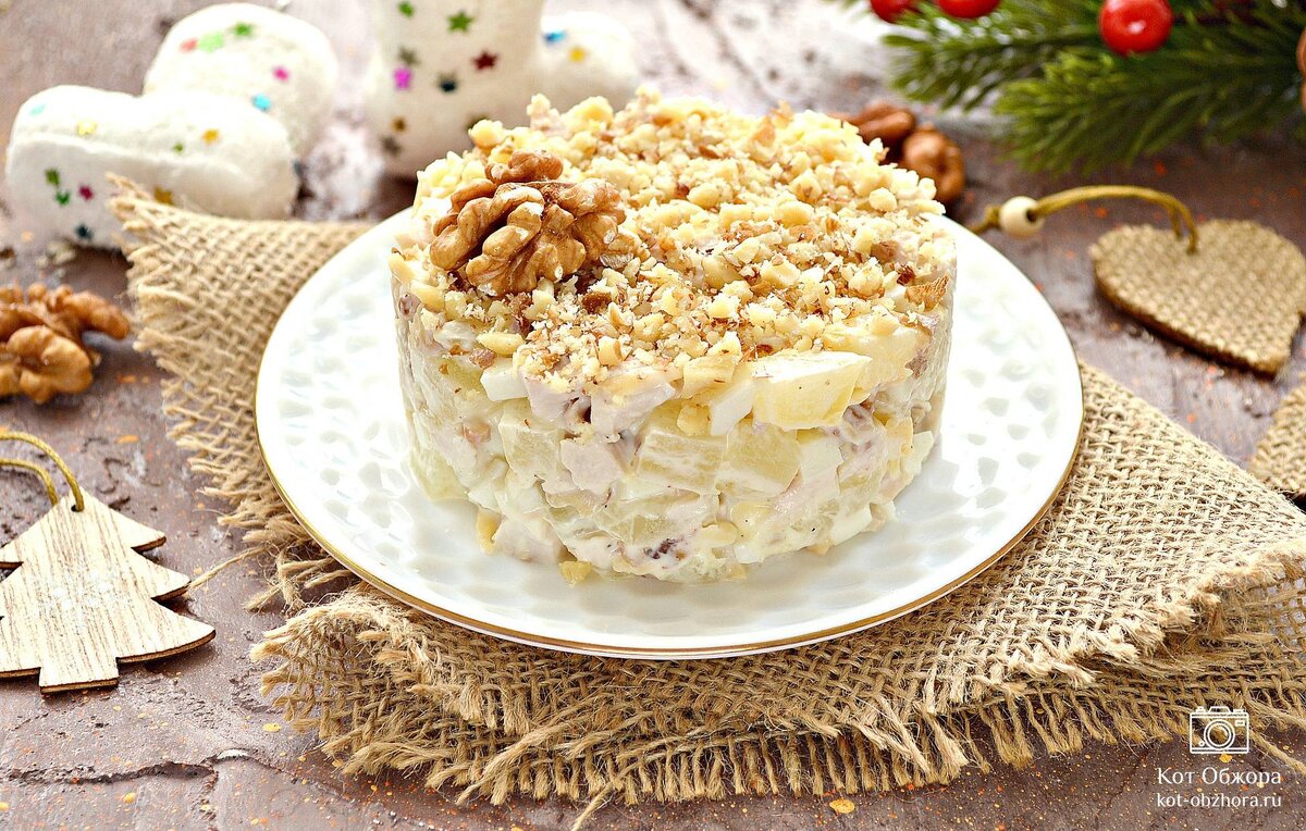 Салат «Ананасовый» 1. Смазать форму тонким слоем майонеза Далее все выкладывается слоями 2. Курица 3. Майонез 4. Консервированные ананасы 5. Майонез 6. Вареные яйца 7. Майонез 8. Натертый на мелкой терке сыр 9. Майонез 10. Грецкие орехи (измельченные) Для удобства и чтобы не было излишка майонеза, положите его в целлофановый пакет, сделайте маленькую дырочку в углу и наносите сеткой. Также есть и другая подача, где всё содержимое перемешивается Приятного аппетита!