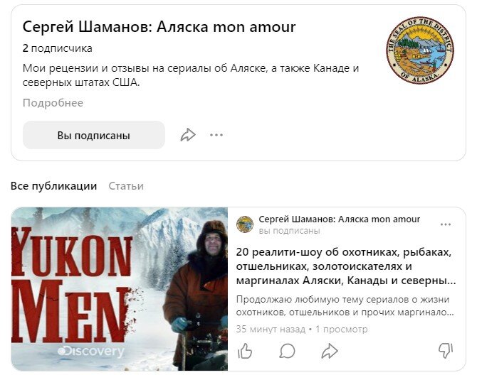 Я очень люблю свои разборы американских реалити-шоу о жизни на Аляске и северных штатах США. Таскал их за собой из блога в блог. Больше года они прожили на этом канале в отдельном разделе. Но в последнее время я много рассказывал о литературе и театре и на канал подписывались городские жители, театралы, которым тема заокеанских сельских маргиналов совсем не интересна. Из-за этого я полностью забросил писать про Аляску. Не хотел растерять уже имеющихся читателей, которым литература и театр намного интереснее. Но... сюда продолжают приходить любители Аляски, я вижу это по статистике. Некоторые активно комментируют, пишут в личку (приходят отсюда ко мне в соцсети). Ждут новых статей. Но, видя что вместо Аляски выходят статьи о литературе и культуре (как и должно быть этом на канале), уходят в небытие. После долгих раздумий я решил создать для Аляски отдельный канал. Много чести, конечно, для трёх статей. Но зато там я смогу безбоязненно продолжать писать о чудаковатых трапперах, тунеядцах и бездельниках страны победившего капитализма, не боясь потерять культурно ориентированных подписчиков. Поэтому все, кто пришёл сюда из-за Аляски, переподписывайтесь на мой новый канал (ссылка так же продублирована в самом низу статьи). Я не обещаю шквала статей, потому что пишу я на эту тему не часто, а только тогда, когда есть возможность посмотреть и проанализировать очередной сериал. Что требует времени. Но, изредка, время от времени я что-нибудь буду там публиковать. По крайней мере, не потеряемся.