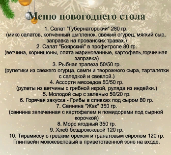 Вовсю в соцсетях уже началась рассылка объявлений от развлекательных центров, кафе и ресторанов, приглашающих детей и взрослых на новогодние мероприятия и корпоративы. Цены разные, к примеру, мне пришла реклама ресторанного корпоратива на декабрьские даты, где на 1 человека билет стоит от 2500 до 3500 рублей, в зависимости от выбранной даты. Сюда входит и программа, и закуски, и ведущий на празднике. По ресторанам я не ходу - бюджет не позволяет. А вот меню в афише посмотрела, оценила и запомнила, можно и повторить дома. Главное - удобно, ничего придумывать уже не надо, тут и 2 салата на разный вкус, рыбные рулетики, мясное ассорти, сырная тарелка, горячее с мясом и грибами, безалкогольные напитки. Красота. Бери - и пользуйся. Не надо голову ломать, чем же гостей угощать с вечера до ночи. Вот само меню, всё подробно прописано. Название ресторана нам ни к чему, а списочек стоит сохранить. 2 салата и 2 вида закусок - более чем достаточно С экрана компьютера не особо разобрать, наверное,