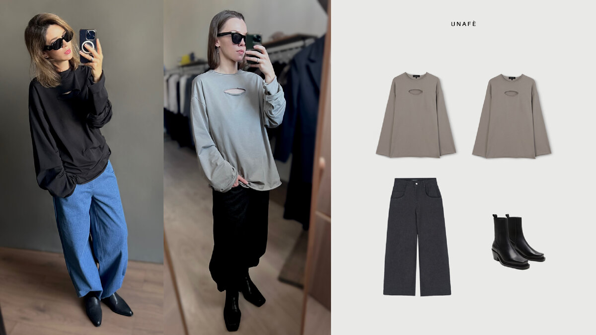 Подумали мы и сделали подборку-инверсию образов Виктории с джинсами-трубами: первую статью можно прочитать здесь. Креативный директор U N A F È Валерия показывает, как просто брать идеи внутри бренда и создавать свое прочтение. Лонгслив на лонгслив Лонг с «дырочкой» стал визитной карточкой U N A F È. Изделие повторяем из сезона в сезон, потому что благодаря этой модели практически открыли портал вдохновения для всевозможных стилизаций. В этом сезоне рекомендуем попробовать «double-longsleeving» одного и того же оттенка. Образ: • Лонгслив с необработанным краем Ash • Джинсы свободного кроя Camminare Лонгслив на толстовку Открытие Виктории, после которого жизнь (наша точно) не станет прежней. Лонгслив с необработанным краем отлично смотрится даже поверх плотного футера. При этом образ не выглядит перегруженным, совсем наоборот — подобный акцент полностью создает настроение и подчеркивает ваш стиль. Образ: + Толстовка из премиального футера Valquiria Для интровертов Если привлека