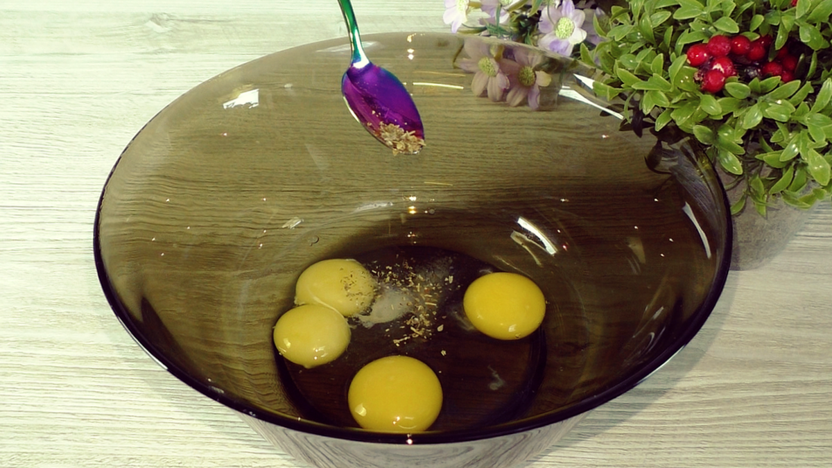 Выкладываю грибы на сито, чтобы ушло лишнее масло. По рецепту надо использовать 3 яйца, у меня третье яйцо попалось с 2-мя желтками. Добавляю соль примерно 0.5 ч. л., сахар, сушёные травы почти 0.5 ч. л.