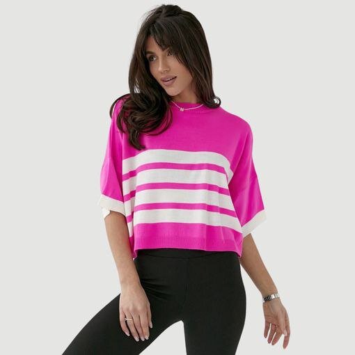 Удобный джемпер в крупную полоску с коротким рукавом.