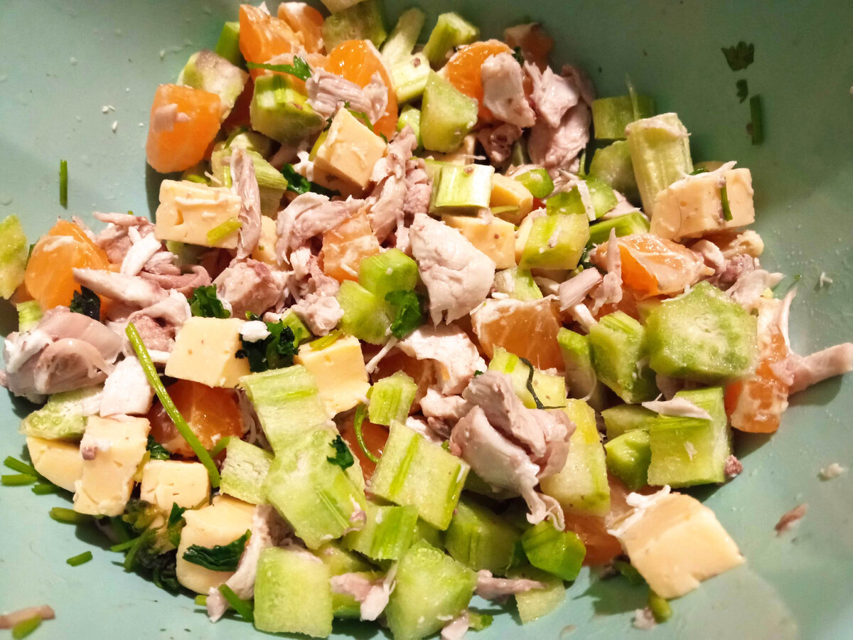 Продолжаю рубрику #безотходная кулинария и #кайнозояхозяюшка. Что нашлось в холодильнике? -вареная курица -твердый сыр -мандаринка -капуста кольраби. Стебли. В качестве заправки - соевый соус и кефир (йогурта не было) Это правда вкусно!