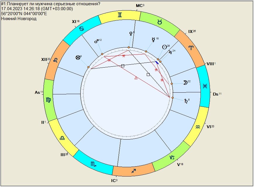 Вопрос задала девушка. Она встречается с молодым человеком больше года. Походы в кино, прогулки в парке, секс, просмотр фильмов вечерами её вполне устраивают, однако, он не поддерживает разговоры об их совместном будущем. Её не устраивает, что нет понимания к чему приведут их отношения. Радикальность: Карта Радикальна. Рассмотрел. Герои: Кверент (девушка) – Меркурий в Тельце, Луна в Рыбах. Естественный управитель - Венера в Близнецах. Квезит (молодой человек) – Юпитер в Овне. Естественный управитель – Солнце в Овне. Разбор (астрологическим языком): При рассмотрении вопросов взаимоотношений ключевую роль играет выбор между тем, кого выбрать Сигнификатором Кверента и Сигнификатором Квезита. Вариант 1 – Сигнификаторами выбрать У1 (Меркурий) и У7 (Юпитер). Но! У1 и У7 не видят друг друга (между ними 21 градус). Между ними нет никаких рецепций ни по владению, ни по изгнанию. Они оба говорят, что связи между девушкой и парнем нет и не будет. Но это на первый взгляд. Меркурий на момент зад