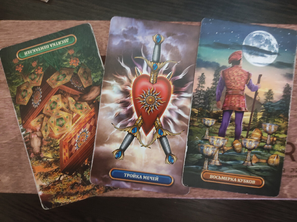 Начнем с Перевернутой 10 Пентаклей - символа изобилия и материального благополучия. Это время для переоценки ваших ценностей и приоритетов. 3 Меча напоминают о прошлых ранах, которые нужно заживить, а 8 Кубков предвещают радость и удовлетворение. 5 Кубков могут символизировать некоторые потери, но не забудьте, что всегда можно найти путь к внутреннему успокоению.