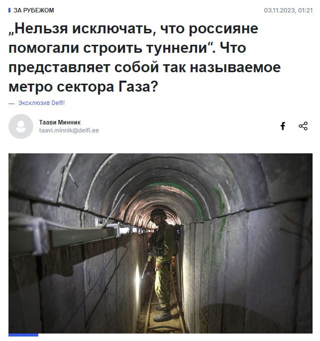 В недавних сенсационных новостях, которые разразились как грозовая буря в эстонских СМИ, было заявлено, что тоннели для ХАМАСА, оказывается, строили русские. Российский след был обнаружен, и несомненно, это вызвало сенсацию. Оказывается, московские метростроители взялись за это дерзкое мероприятие, и их работа в тоннелях Газы, как выяснилось, поражает даже израильских солдат. Они неожиданно получили "пиздюдей" от этих несгибаемых российских строителей. По слухам, метростроители сообщили, что вся эта война им, мягко говоря, безразлична, и Сергей Семёнович Собянин приказал им закончить Замоскворецко-Палестинскую линию до Нового года. Ведь, кто-то должен строить метро, даже если это метро в самом неожиданном месте. Что ж, можно понять эстонцев – их разведка столкнулась с задачей, которая, казалось бы, слишком долго оставалась нераскрывшейся. Недавно они только узнали , что, россияне, как выяснилось, отжали у ххлов целых четыре области. Так что, возможно, они просто подошли к туннелям