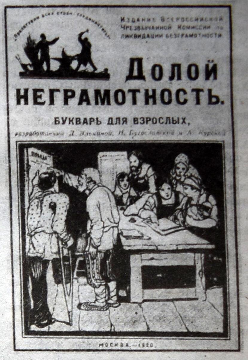 В 1920–1924 годах вышли два издания первого советского массового букваря для взрослых (авторства Д. Элькиной и др.). Букварь назывался «Долой неграмотность» и открывался известным лозунгом «Мы – не рабы, рабы – не мы». А для населения начали издаваться массовые газеты и журналы , специальные приложения для малограмотных. В таком листке-приложении в первом номере журнала «Крестьянка» (в 1922 г.) в популярной форме излагалось содержание декрета о ликбезе 1919 г.